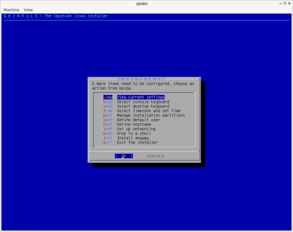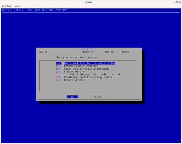 Gaia is a simple text-based installer running on top of a simple memory-based linux system that allows you to enter all basic information needed to install LGL on your computer. It is implemented as a collection of shell-scripts using dialog as its text-based user interface.